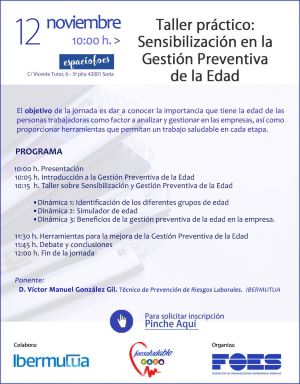 El taller práctico ‘Sensibilización en la Gestión Preventiva de la Edad’ se impartirá en el EspacioFOES el 12 de noviembre a las 10 horas, organizado por FOES a través de FOESaludable con la colaboración de Ibermutua.
