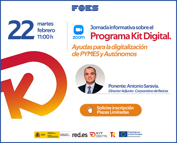 El webinar gratuito ‘Programa kit digital para la digitalización de pymes y autónomos’, de carácter gratuito, se celebra el día 22 de febrero a las 11 horas. Para participar en él es necesaria inscripción en www.foes.es.