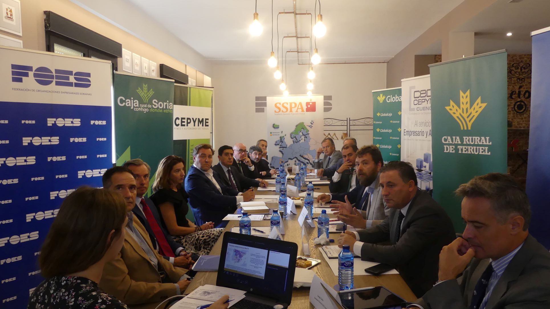Los presidentes de las Cajas Rurales de Soria, Teruel y Cuenca se reunieron ayer en Soria con la Red SSPA –fundada por FOES, CEOE CEPYME Cuenca y CEOE Teruel - para seguir avanzando en la lucha contra la despoblación de las tres provincias, reconocidas por la Unión Europea como zonas especialmente despobladas y posibles receptoras de las conocidas como “ayudas de funcionamiento”.