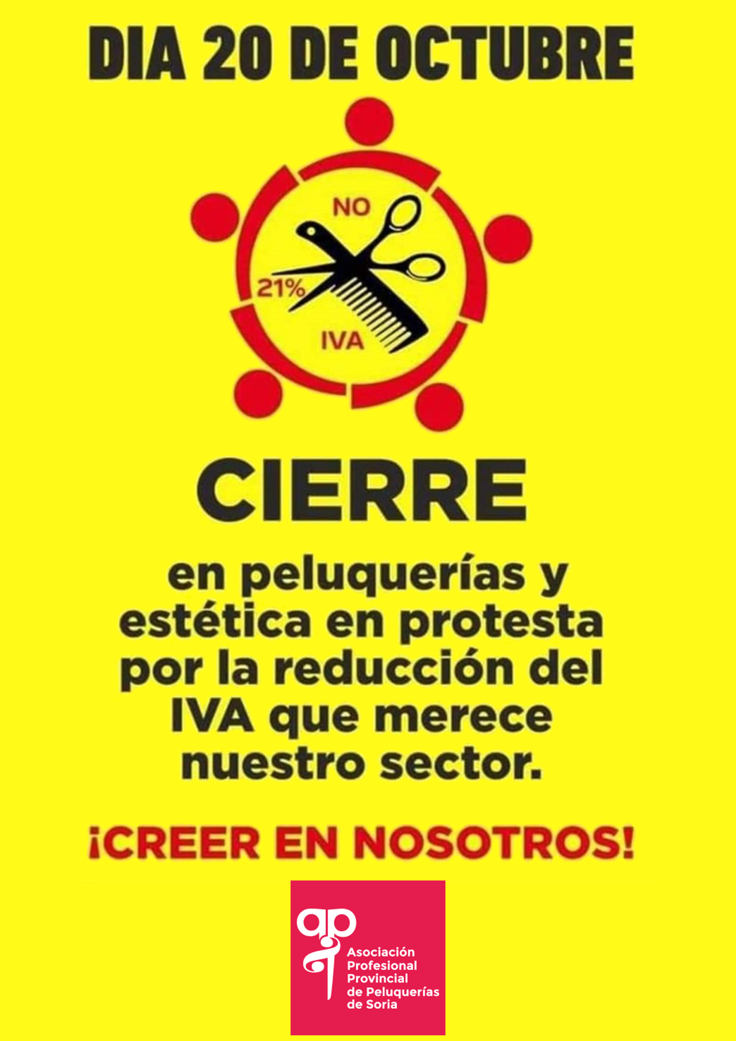 La Asociación Profesional Provincial de Peluquerías de Soria ha convocado un cierre el día 20 de octubre en protesta contra la falta de ayuda al sector y pidiendo nuevamente la vuelta al IVA reducido.