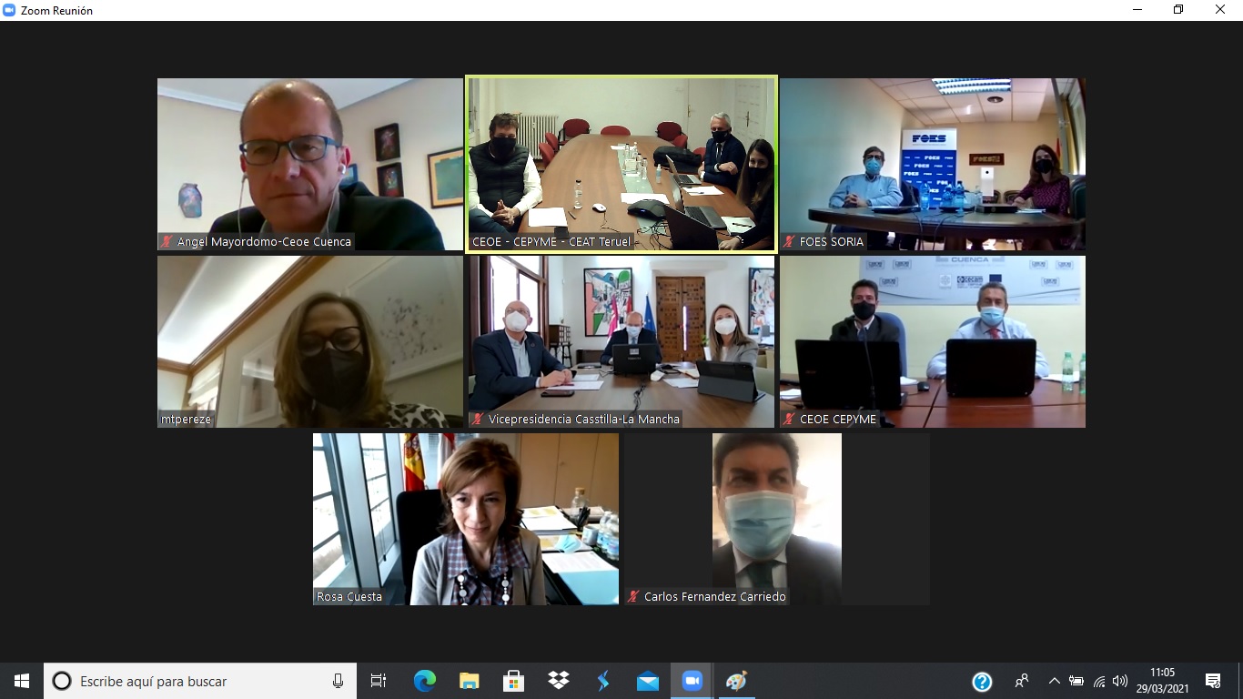 En la videoconferencia mantenida con los representantes de las Comunidades Autónomas de Castilla y León, Castilla-La Mancha y Aragón, las CEOEs de Soria, Cuenca y Teruel han explicado el proyecto ‘5 for Rural’. La propuesta ha sido valorada positivamente por el Consejero de Economía y Hacienda de la Junta de Castilla y León, Carlos Javier Fernández Carriedo, por el Vicepresidente de la Junta de Castilla-La Mancha, José Luis Martínez Guijarro, y por la Consejera de Presidencia y Relaciones Institucionales del Gobierno de Aragón, Mayte Pérez Esteban.